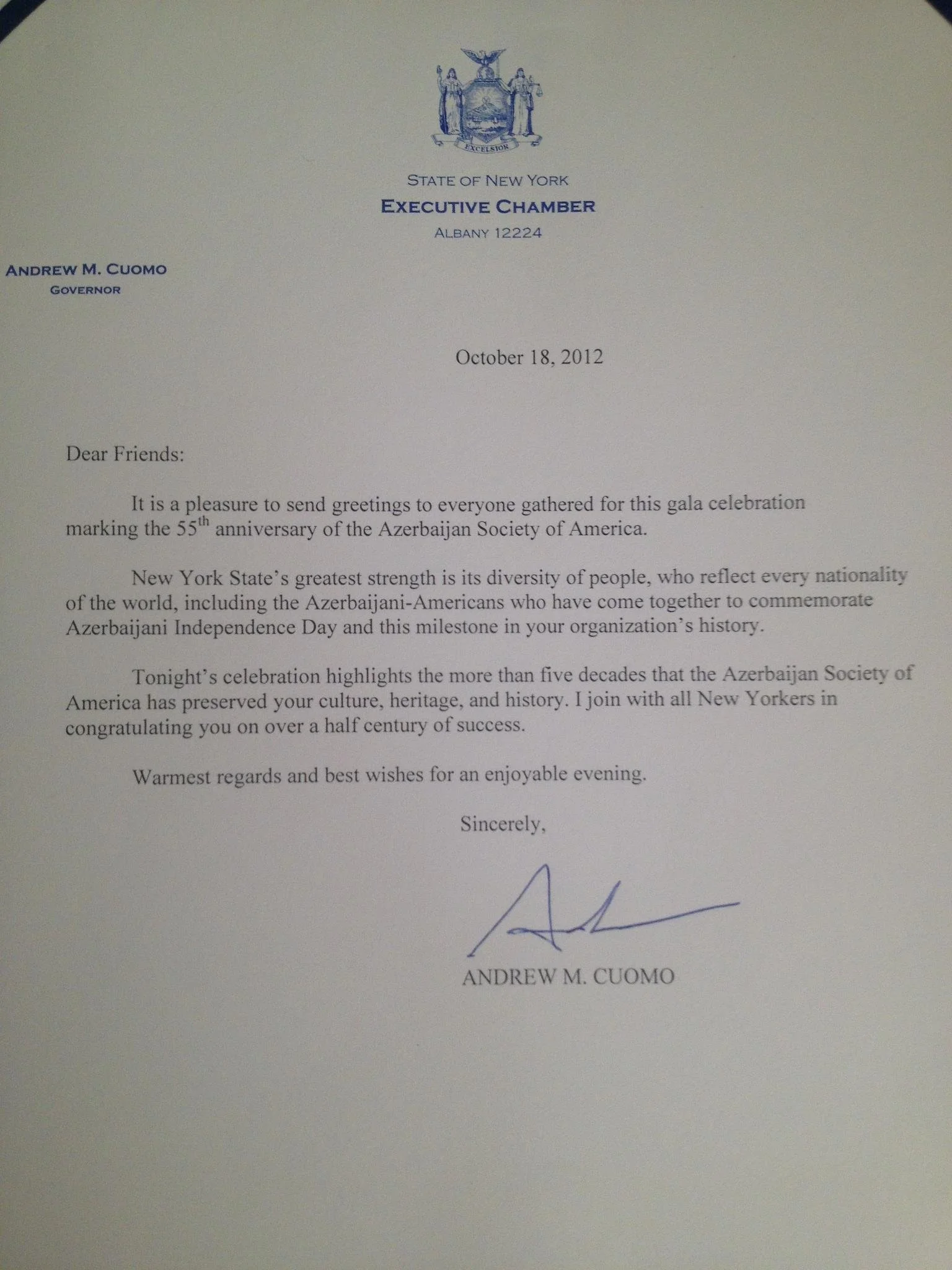 New York State's greatest strength is its diversity of people, who reflect every nationality of the world, including the Azerbaijani-Americans who have come together to commemorate Azerbaijani Independence Day and this milestone in your organization's history.